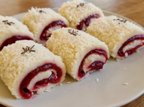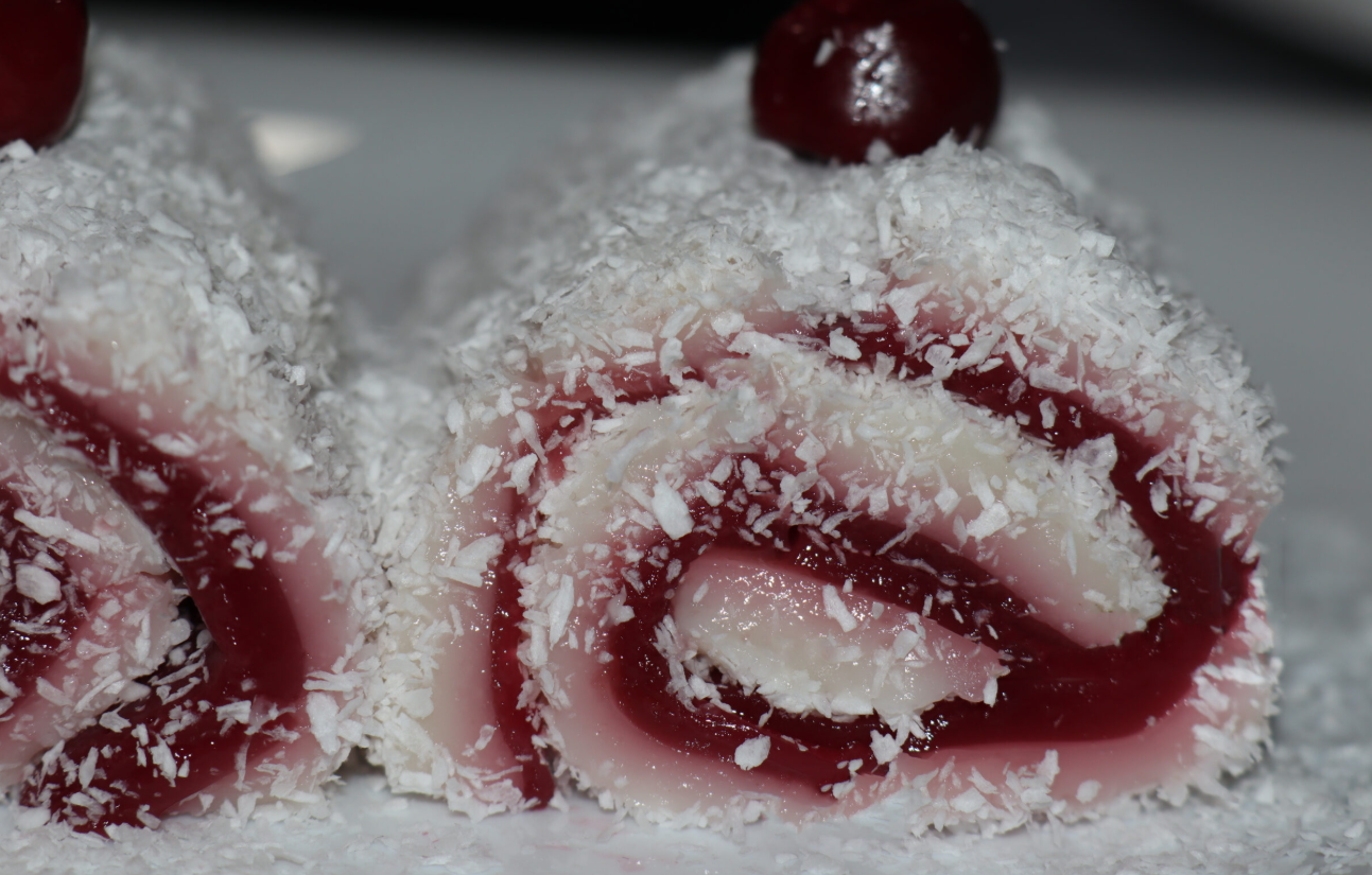 Oštrim nožem režite roladu na male kiflice ili kolutiće. Svaki komad otkriva prelijep spiralni uzorak kokosa i višanja – pravi mali wow-efekat.