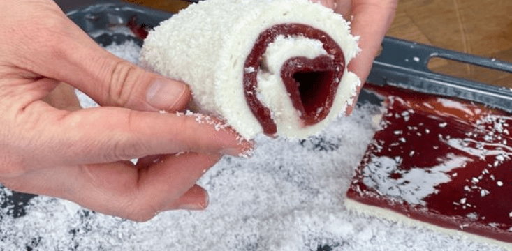 Uz pomoć papira za pečenje, lagano zarolajte smjesu s jednog kraja prema drugom. Radite polako i bez pritiska. Ako negdje pukne – nema panike, kokos će sve sakriti. 😉