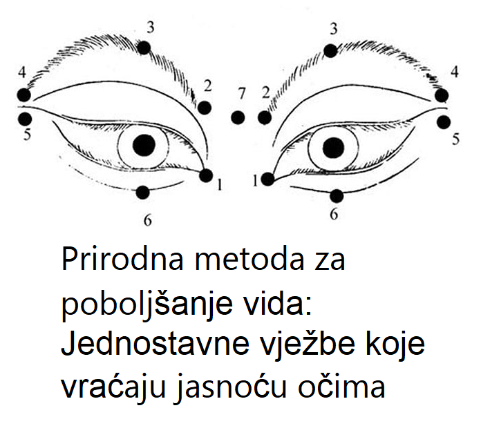 Vrhovima srednjeg prsta i kažiprsta lagano pritisnite očne jabučice 8 puta, bez nelagode. Zatim kažiprstom blago pritisnite tačke ispod obrva i na sljepoočnicama — po 2 puta svaku.