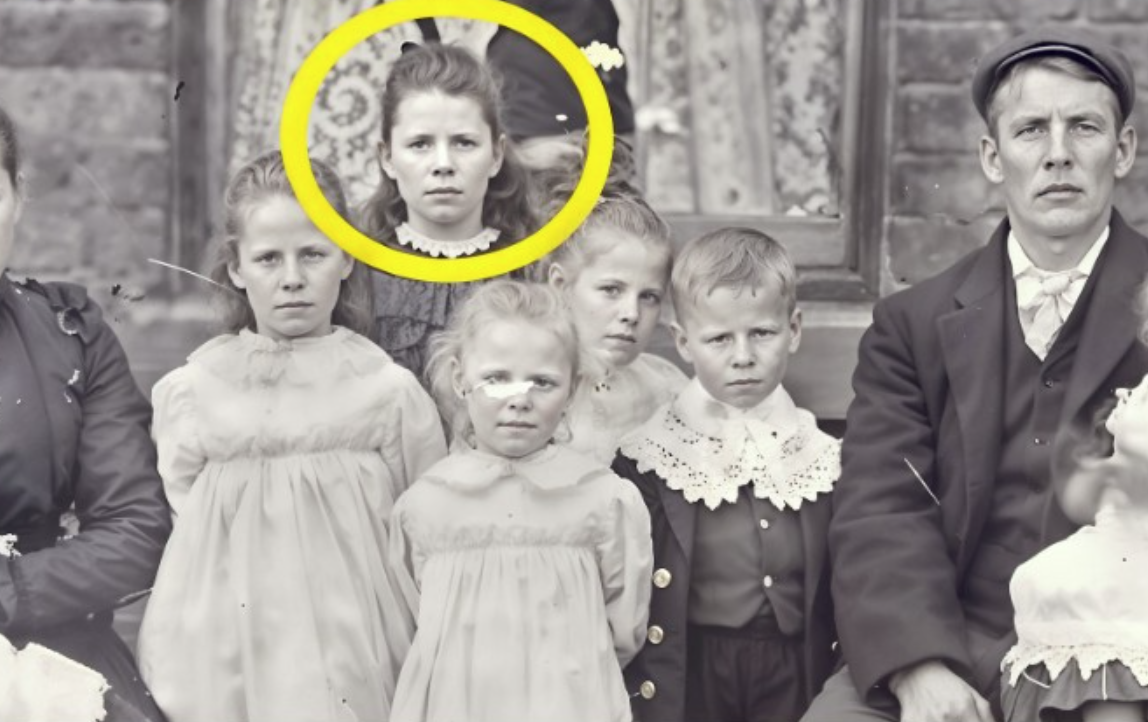 Kada je fotografija poslana na digitalnu restauraciju, stručnjaci su primijetili nešto što ih je potpuno zapanjilo. U gornjem dijelu slike, iza djece, pojavilo se lice žene ozbiljnog izraza – lice koje nije bilo vidljivo na originalu.