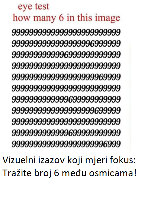 Test “Koliko brojeva 6 pronađete za 10 sekundi” možda nije naučni alat za mjerenje inteligencije, ali sigurno jeste zanimljiv i koristan izazov za mozak. On nas podsjeća koliko je važno trenirati pažnju i održavati mentalnu kondiciju.